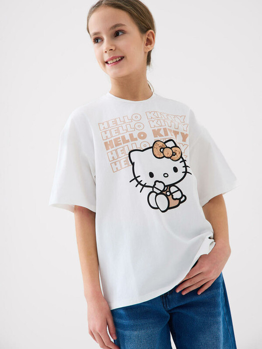 Футболка оверсайз для девочки подростка. Модель выполнена из эластичного хлопкового трикотажа джерси. На груди расположен крупный принт с любимым персонажем Хеллоу Китти.