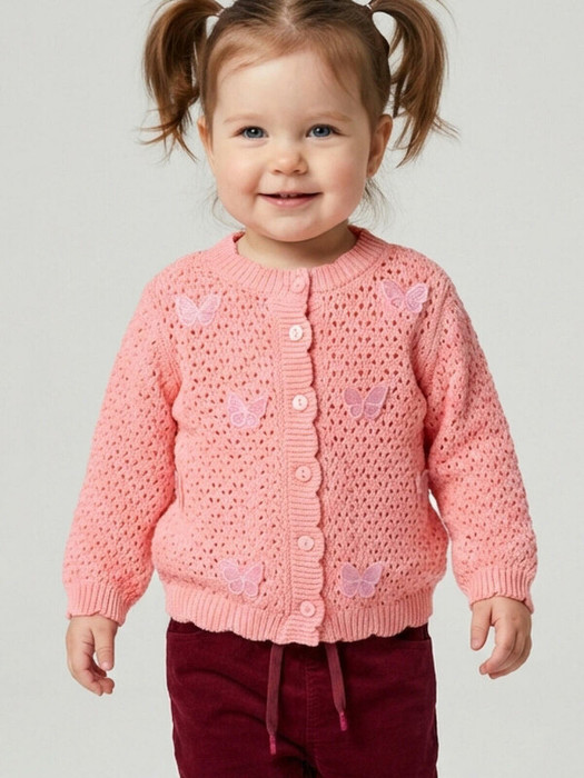 Детский кардиган для девочки. Модель из мягкого, вязаного трикотажа. Круглая горловина, длинные рукава и аккуратная застежка на пуговицах спереди. Основной акцент – декоративные вязаные бабочки.