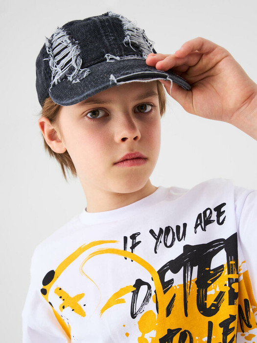 Бейсболка для мальчика подростка. Модель из черной джинсы с эффектом варки и модными потертостями. Форма классическая, с изогнутым козырьком. Сзади — застежка с пряжкой для регулировки размера. Отверстия для вентиляции.