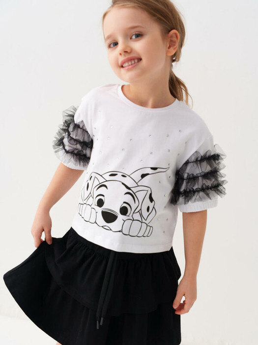 Детский комплект для девочки. Состоит из футболки с коротким рукавом и юбки. Выполнен из мягкого хлопкового трикотажа. Футболка с принтом милого щенка из "101 далматинца". Рукава футболки украшены оборками из сетки. Юбка с воланами, из легкого трикотажа имеет эластичный пояс с бантиком.