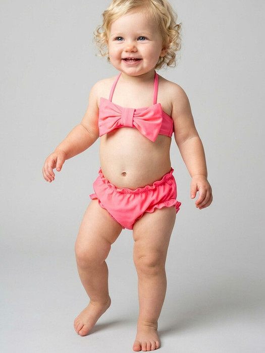 Купальник раздельный для девочки. Верх выполнен в виде топа с крупным декоративным бантом, а спереди и сзади добавлены завязки. Бретели регулируются по длине. Плавки на подкладке украшены воланами по краю и мягкой резинкой на талии и ножках. Все края обработаны эластичной тесьмой, чтобы изделие хорошо сидело на теле и не натирало. Благодаря UF-защите, ткань сохраняет первоначальный вид даже при длительном пребывании на солнце. Подходит для плавания и активного отдыха.