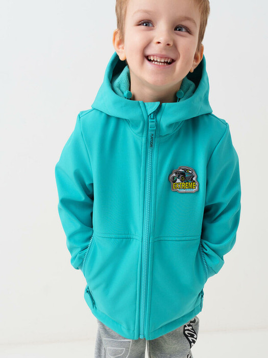 Куртка детская из софтшелла для мальчика. Температурный режим от +20°C до +10°C. Внутри — мягкая флисовая подкладка. Капюшон несъемный с утяжкой стопперами. На груди расположена яркая нашивка. Внутренняя утяжка по низу. Два боковых кармана на молниях. Трикотажные манжеты.  Утяжка по низу куртки.