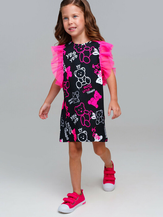 Платье детское для девочки. Платье из качественного и приятного на ощупь трикотажа джерси. Высокое содержание хлопка 95%. Благодаря наличию эластана в составе ткани изделие проще в уходе и держит форму. Рукава-крылышки из сетки. Модель выполнена из качественного и приятного на ощупь трикотажа.