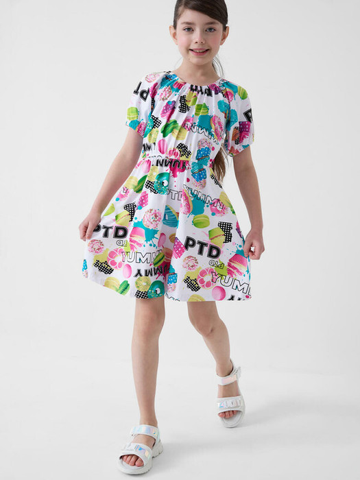 Яркое платье для девочки подростка. Модель из мягкого хлопкового трикотажа джерси с короткими рукавами и круглым вырезом. Украшено красочным принтом по всей поверхности — с изображениями капкейков, макарунов, пончиков и конфет, дополненных текстами и графикой. Платье средней длины, свободного кроя, с эластичной вставкой на талии для удобной посадки. Рукава и вырез оформлены мягкой внутренней резинкой.