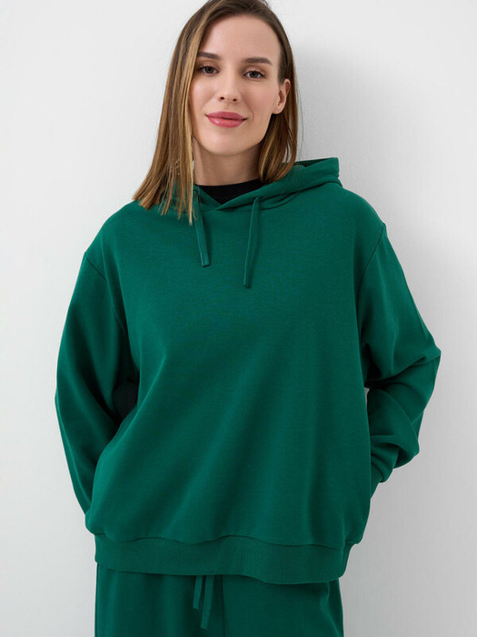 Женское худи оверсайз. Выполнена из хлопкового футера без начеса. Капюшон регулируется шнуром. Два боковых кармана. Низ изделия и рукава оформлены эластичными резинками.