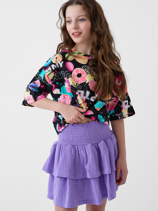 Юбка для девочки подростка. Лёгкая и воздушная модель из мягкой фактурной ткани. Модель в длине мини, расклёшевого силуэта. Широкий пояс на резинке, внутри добавлена силиконовая лента, чтобы юбка надёжно держалась на талии.