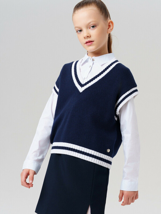 Стильный школьный укороченный темно-синий жилет для девочки подростка.