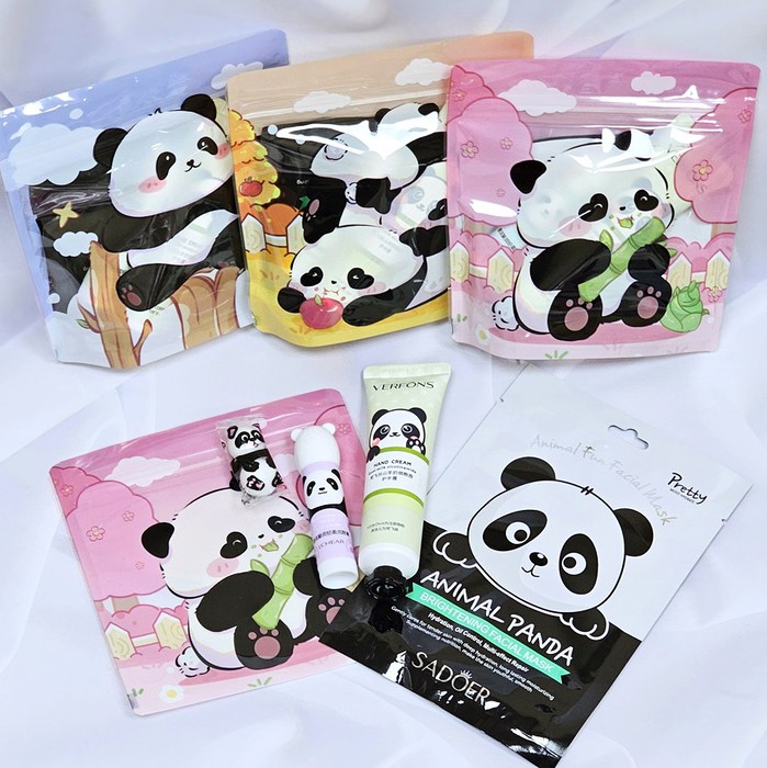 В набор входит:, 1. Тканевая маска с рисунком панды Sadoer., 2. Бальзам для губ прозрачный в виде панды., 3. Крем для рук с пандой 30 гр., 4. Драже шоколадное "Панда" 2 шарика в упаковке., 5. Красивый подарочный пакет на застежке-молнии с рисунками панды.
