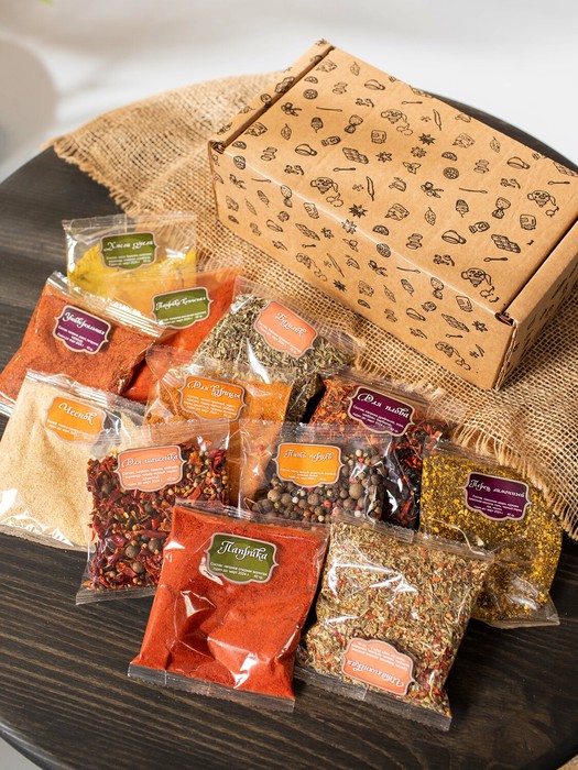 Подарочный набор специй включает в себя следующие приправы и специи: -приправа для шашлыка-приправа для плова-приправа для курицы-копченая паприка-паприка-лимонный перец-чеснок-базилик-хмели-сунели-приправа 6 перцев-универсальная приправа-итальянская приправа-пажитник.В подарочный набор входит 13 специй по 40 грамм