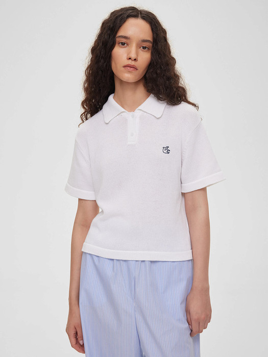 Поло с коротким рукавом, отложным воротником, застежкой на пуговицы и контрастной вышивкой по переду.