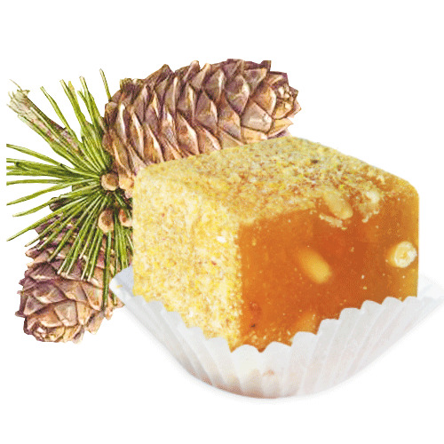 Состав:сахар, вода, патока, крахмал кукурузный, экстракт сосновых почек, кедровый орех, куркума, агар-агар.