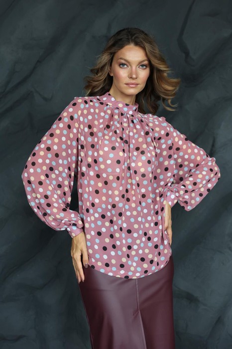 Блузка с рукавом реглан и манжетой на пуговице. Воротник стойка с застежкой на 2 пуговицы. Сборка от воротника по переду.