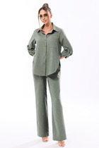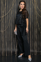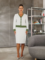Костюм 2-предметный. Состоит из жакета и юбки. Жакет 2-бортный, на подкладке. Рукав короткий, втачной, одношовный, по окату собран складками дляя увеления объёма. Обработаны талиевые вытачки по переду и спинке изделия.