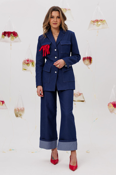 Комплект состоит из жакета и джинс прямого кроя. Приталенный жакет с накладными карманами. Жакет на подкладке. По переду в верхнем кармане декор из алых перчаток, которые можно носить для создания аристокротичного образа. По спинке регулируемый пояс, для более заталенного и женственного силуэта. Длина - 69 см. Джинсы с высокой посадкой и отворотом по низу. Сзади на кармане выполнен декор в виде "золотого сердца". Крой расширенный к низу. Длина брюк - 100 см