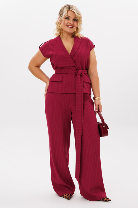 Комплект 2-ка, состоящий из жилета и брюк. Жилет с отложным воротником и поясом. Перед жилета на запах с застёжкой на кнопки, на плечах декоративные паты. По бокам жилета выполнена имитация клапанов карманов. Брюки прямого силуэта на эластичной резинке по талии. По переду расположены карманы с наклонным входом.