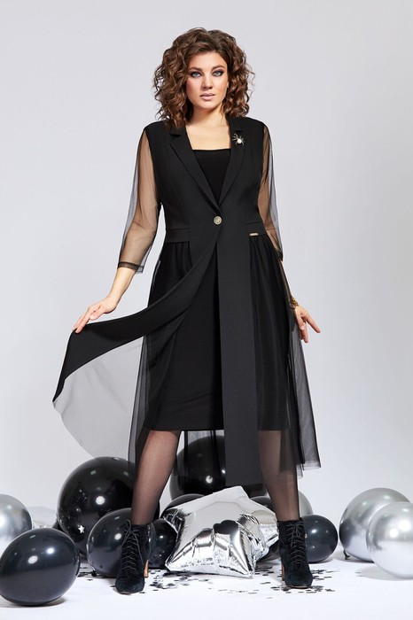 Комплект женский, состоящий из накидки и платья. Накидка полуприлегающего силуэта. Воротник пиджачного типа. По переду рельеф от плеча. Боковая часть переда-отрезная по линии талии с отделочной деталью. Спинка-отрезная по линии талии с фигурной отделочной деталью. В верхней части спинки-рельефы от плеча. Рукав втачной. Нижняя часть и рукав из отделочной ткани. Нижняя часть "полусолнце". По переду застёжка на пуговицу. Нижнее платье на бретелях, прилегающего силуэта. В комплекте прилагается украшение.