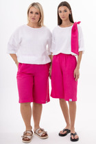Костюм-двойка из льняной рубашки и брюк. Рубашка прямого силуэта с застежкой на пуговицы со спущенной проймой. По спинке прямая кокетка. По переду наклонные рельефы на застежке со шлицей, воротник рубашечный на стойке. Низ фигурной формы. Брюки «палацио»: высокая посадка, от пояса заложены складки, застежка на молнию и пуговицу, наклонные карманы по переду и листочка-обманка по спинке.