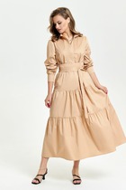 Свободный А-силуэт, заниженная линия плеча, круглая горловина, переходящая на спинке в V-образный вырез с кулисой, завязывающейся на бант. На спинке - центральная застёжка.