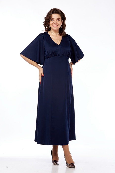 Праздничное женственное платье выполнено из пластичной шелковистой ткани с эффектом атласа, которая очень красиво струится и добавляет шарм. Платье на подкладке из тонкого трикотажа. Впереди удлиненный вырез горловины, подрез под грудью с сборкой на лифе. На боковых деталях подрезы, поддерживающие талию. По спинке рельефы. Платье к низу расширено. Рукав короткий, в виде крыла. Отличный вариант для праздника и торжественных мероприятий.