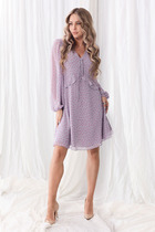 Платье женское относится к нарядной торжественной одежде. Платье полуприлегающего силуэта, с отлетной накидкой длиной за колено. Перед с двумя нагрудными вытачками, с двумя талиевыми вытачками. Спинка с двумя талиевыми вытачками и средним швом, заканчивающимся шлицей. Застежка на потайную тесьму-молнию в среднем шве спинки. Горловина круглая, обтачная, без воротника, по горловине закреплена накидка. Слева на уровне линии талии отделочным хлястиком, декорированным тесьмой накидка закрепляется на платье, нижняя часть накидки закреплена в левом боковом шве. Накидка с фигурным низом. Платье без рукавов. Длина спинки 103 см. Длина накидки от горловины 38 см