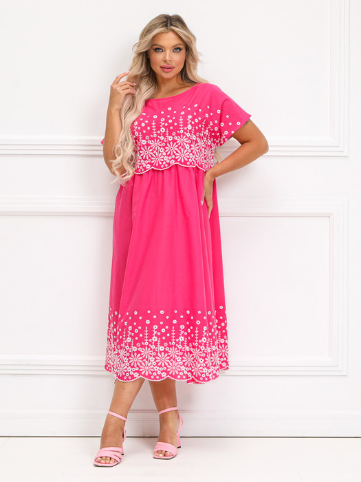 Восхитительное платье полуприлегающего силуэта из текстильной ткани цвета фуксия с вышивкой. Круглый вырез изделия обработан окантовкой. Платье с цельнокроеными рукавами. Линия талии завышена, эффектно подчеркнута сборкой. Длина изделия по спинке от плечевого шва до низа изделия — см. Рост фотомодели — 170 см.