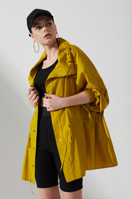 Жакет из тонкой плащёвой ткани, свободного кроя «оверсайз» длиной ниже линии бёдер. На уровне талии подрез с кулисой и втянутым шнуром. Плечевой шов спущен, рукава длиной до запястья с притачными манжетами с эластичной тесьмой. Жакет с высоким, мягким воротником-стойкой.  Верхние части переда с диагональными рельефами от горловины до подреза по талии, с функциональными карманами с листочкой и фигурными клапанами, входящими в шов рельефа, угол клапана  закреплён пробивной кнопкой к деталям переда. Верхняя часть спинки с диагональными рельефами от горловины до подреза по талии, нижняя часть  спинки без особенностей. Застёжка центральная, от верхнего края воротника до низа, на пробивные кнопки на притачной планке. По швам стачивания рельефов, швам  втачивания рукавов, по деталям клапанов и планок прострочена отделочная строчка. По верхнему краю воротника отстрочена кулиса и втянут шнур. Линия низа прямая. Жакет без  подкладки.