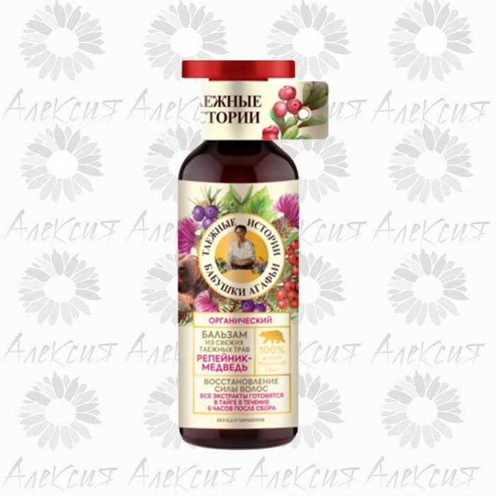 Состав: Aqua with infusions of Organic Arctium Lappa Root Extract (органический экстракт таежного репейника), Organic Arctium Lappa Seed Oil (органическое масло таежного репейника), Organic Pinus Sibirica Seed Oil (органическое масло кедра), Organic Betula Alba Bud Extract (органический экстракт почек березы), Organic Pinus Pumila Needle Extract (органический экстракт кедрового стланика), Tar Oil (пихтовая живица), Organic Arctostaphylos Uva Ursi Leaf Extract (органический экстракт медвежьей травы), Organic Pelargonium Graveolens Oil (органическое масло сибирской герани), Organic Vaccinium Myrtillus Fruit Extract (органический экстракт черники), Organic Sorbus Aucuparia Fruit Extract (органический экстракт ягод рябины), Organic Vaccinium Vitis-Idaea Fruit Extract (органический экстракт ягод брусники), Organic Chamomilla Recutita Flower Extract (органический экстракт ромашки), Organic Melissa Officinalis Flower/Leaf/Stem Extract (органический экстракт мелиссы), Origanum Vulgare Flower/Leaf/Stem Extract (органический экстракт душицы); Cetearyl Alcohol, Distearoylethyl Dimonium Chloride, Lauryl Glucoside, Guar Hydroxypropyltrimonium Chloride, Citric Acid, Benzyl Alcohol, Benzoic Acid, Sorbic Acid, Aroma (натуральный ароматизатор эвкалипта и душицы), Caramel, Chlorophyllin-Copper Complex.