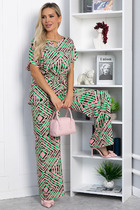 Костюм женский двух предметный: блузка и брюки, может использоваться как для повседневной носки, так и нарядная одежда. Блузка полуприлегающего силуэта. Перед с двумя нагрудными вытачками, цельнокроенный. Спинка с двумя талиевыми вытачками, с декоративной вставкой из отделочной ткани, вверху с разрекзом. Горловина круглая, обтачная, без воротника. Застежка на одну навесную петлю и одну пришивную пуговицу по разрезу спинки. Рукав, втачной, короткий, одношовный. Низ спинки, декоративная вставка спинки декорируется кружевом. Блузка с плечевыми накладками. Брюки женские длинные, слегка заужены к низу. Передние и задние половинки с двумя талиевыми вытачками. Застежка на тесьму-молнию . Верхний срез с притачным поясом, застегивающимся на одну обметанную петлю и одну пришивную пуговицу. Пояс собран на эластичную ленту от боковых швов к вытачкам задних половинок. Длина блузки 65.5 см. Длина рукава 24.5 см. Длина брюк 107см.