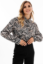Строгий отложной воротник на стойке и функциональная застёжка на пуговицы по всей длине придают вещи аккуратную чёткость. Детали - кокетка, карман, воротник и манжеты, выполненные из контрастной однотонной ткани, - создают тонкую игру текстур. Асимметричный низ мягко завершает силуэт, предлагая современное прочтение классической формы.