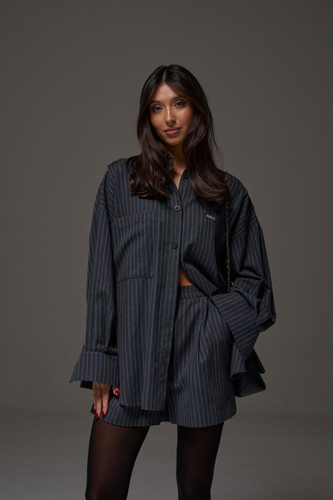 Рубашка прямого свободного кроя. Выполнена из текстильного полотна графитового цвета в полоску. Воротник отложной. Застёжка центральная на пуговицы. По переду справа накладной карман, слева - брендированная нашивка Annete. Рукав спущенный, свободный, с манжетой на пуговице. Длина рукава 51 см. Спинка отрезная со сборкой. Длина спинки 76 см