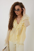Блузка женская прямого силуэта, свободного облегания. Характеристика: Воротник отложной на стойке. Рукав одношовный, втачной, со спущенной линией плеча. На переде по линии груди настрочены прямоугольные накладные карманы. Спинка цельная. В боковых швах обработаны разрезы. Застежка центральная, цельнокроеная планка, застегивающаяся на пробивные петли, пришивные пуговицы. На манжетах декоративная пуговица. Длина рукава 60 см, длина плеча 20 см, длина блузы по спинке 69 см.