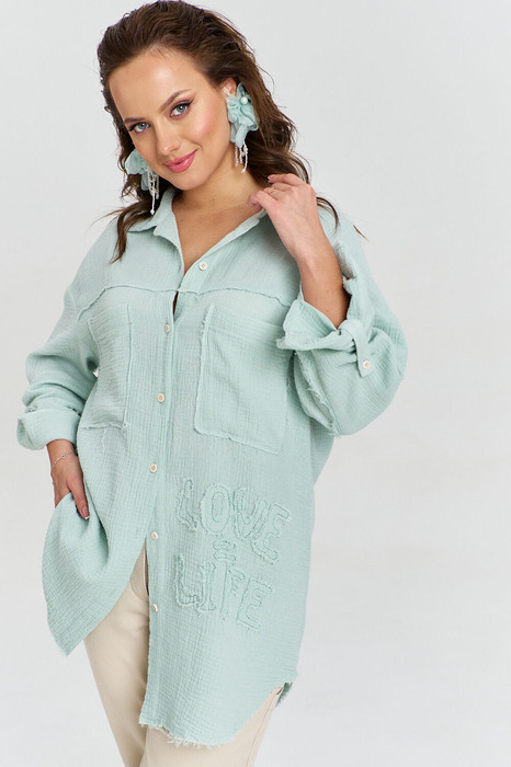 Рубашка из мягчайшего хлопкового муслина, свободного силуэта, застежкой спереди на пуговицы, длинным рукавом и рубашечным воротником. Перед с отрезной кокеткой, накладными карманами и авторскойвышивкой. Спинка с кокеткой и складкой. Рукава с манжетами, длина регулируется хлястиком. Некоторые швы необработаны, что при энзимной стирке придает изделию стильную винтажность.