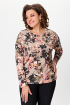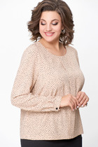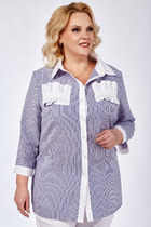 Блузка женская свободного покроя, удлиненная, с рубашечным рукавом на манжете по низу, по переду на уровне груди - накладной карман, застежка спереди на планку с пуговицами, воротник рубашечный на стойке, низ изделия фигурный, с закругленными разрезами по боковым швам.
