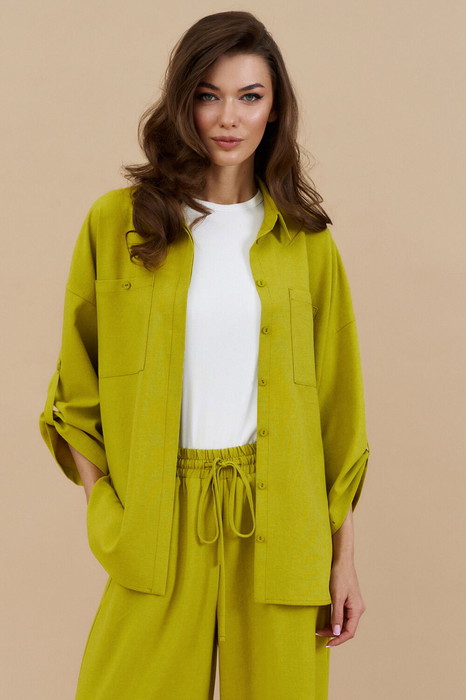 Рубашка женская свободного силуэта "оверсайз". Воротник отложной на стойке. По груди расположены накладные прямоугольные карманы на пуговицах. Рукав одношовный спущенный, с патами по локтям. Застежка по переду потайная, на пробивные петли и пришивные пуговицы.