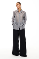 Базовая рубашка. Линия плеча спущена. Рукав длинный на манжете. По переду накладные карманы и застежка на петлю пуговицу. На воротнике пришит декоративный элемент в виде губ. Низ изделия фигурный.