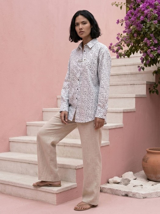 Блуза-рубашка со стояче отложным воротником и центральной застёжкой на петли и пуговицы. Перед с накладным карманом и декоративной деталью с застёжкой на пуговицу. Спинка с отрезной кокеткой и складкой от неё. Рукава втачные с манжетами по низу.