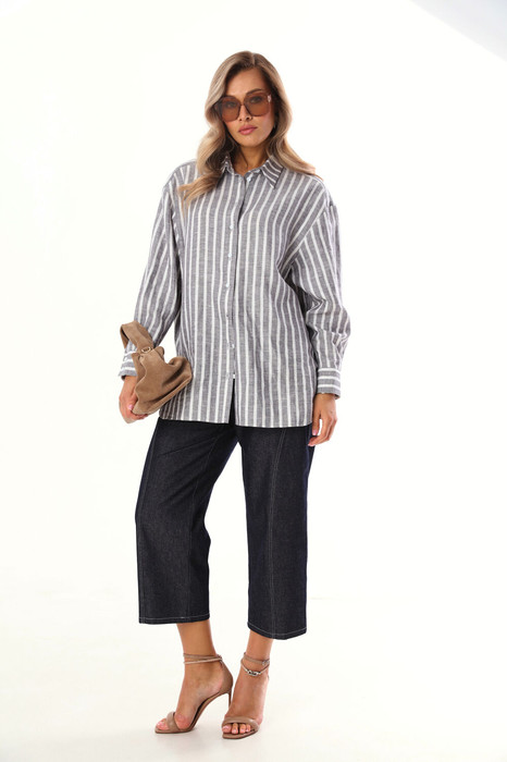 Рубашка женская большого объема, прямого силуэта. На детали спинки расположена двойная кокетка, переходящая на деталь полочки. Под кокеткой на спинке встречная складка. Воротник рубашечный отложной на стойке. Застежка планка центральная на прорезные петли и пуговицы. Линия плеча спущенная, рукав рубашечный, длинный. В нижней части рукава заложены складки, заканчивается манжетой с двумя прорезными петлями и пуговицами. Низ блузки разноуровневый: спереди короче, сзади длиннее.