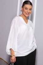 Блуза свободного кроя, прямого силуэта. Линия плеча расширена с плечевой накладкой. Рукав длинный, по низу рукава приточная манжета на застежку петли и пуговицы. Воротник рубашечного кроя с золотыми фиксаторами, застежка на петли и пуговицы. По переду кокетка по косой, в левом боковом шве разрез. По спинке фигурная кокетка, по центру встречная вкладка. В комплектацию входит металлический золотой пояс с застежкой на фиксатор. Ярким дополнительным акцентом является съемный бант, который также можно использовать как пояс.