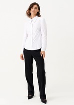 Стильная укороченная  женская  рубашка  свободного силуэта с кокетками спинки и полочек и спущенной линией плеча. Застежка на планку петля-пуговица. Рукав длинный прямой, втачной с манжетой на застёжку петля-пуговица. По низу изделия  притачной пояс  со шнурком для стяжки и завязывания. По воротнику, по кокеткам и по плечевым швам отделочная строчка. На модели размер 48( параметры модели ОГ-90. ОТ-71. ОБ-102 рост 173см)