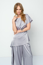 Детали: рубашка прямого силуэта, спущенная линия плеча, застежка на петли и пуговицы, длинные рукава с притачными манжетами, фигурный низ.