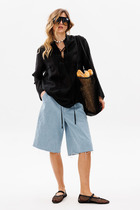 Детали: рубашка прямого силуэта, спущенная линия плеча, застежка на петли и пуговицы, длинные рукава с притачными манжетами, фигурный низ.