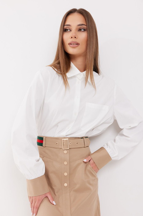 Блузка прямого силуэта. Застёжка по переду на петли и пуговицы. Воротник рубашечный. На передней левой полочке накладной карман. На спинке кокетка и складка. Рукав прямой со сборкой по низу, на манжете. Манжета с застёжкой на кнопки. Низ блузки фигурной формы.