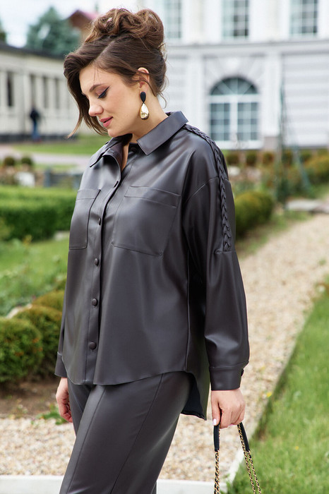 Рубашка— не просто верх, а главный акцент. Кожа, плотная, но податливая, образует «оверсайз» силуэт. Плечо, от места втачивания воротника и до вытачки по рукаву, украшены декоративными косичками из кожаных тесёмок. По переду рубашки застёжка на декоративные пуговицы в тон ткани по планке, и накладные карманы. Воротник рубашечного типа. Линия плеча спущенная. Спинка в рубашке с отрезной кокеткой. Рукав втачной, длинный с локтевым швом и разрезом от низа; заложенной складкой от низа и притачной манжетой. Низ в рубашке ассиметричный. Длина рубашки по спинке 81 см. Длина рукава рубашки 52 см.