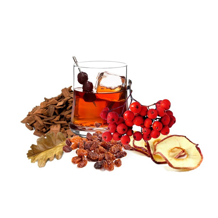 Состав: Рябина, изюм, щепа дубовая, яблоки сушеные . Рецепт: Все специи залить 2 литрами водки/спирта/самогона (крепостью 40 градусов), настаивать 10 дней в темном месте, периодически взбалтывая. Добавить 2 ст. л. сахара. Затем всё процедить и дать "отдохнуть" несколько дней. масса 71 г
