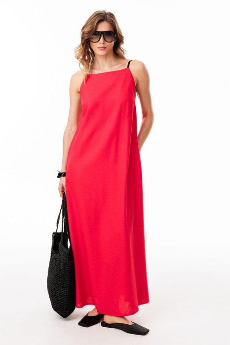 Сарафан выполнен из льна. Сарафан А-образного силуэта, длиной до линии щиколотки, на регулируемых бретелях. По переду обработаны нагрудные вытачки. На спинке обработан средний шов, округлый вырез с контрастными завязками. Пройма V-образной формы.