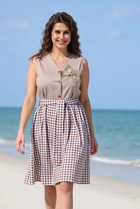 Сарафан из трикотажного полотна «кулирка» в сочетании двух видов в единой цветовой гамме: с мелкоузорчатым набивным рисунком, имитирующим ткацкое переплетение «рогожка» и с рисунком в мелкую клетку, отрезной по линии талии, с V-образной горловиной, центральной бортовой застежкой на обметанные петли и пуговицы и вышивкой на левой полочке лифа. Горловина спинки и проймы окантованы основным материалом. Юбка присборена по шву соединения с лифом. Съемный завязывающийся пояс фиксируется двумя шлевками из окантовки, вставленными в боковые швы на уровне талии.