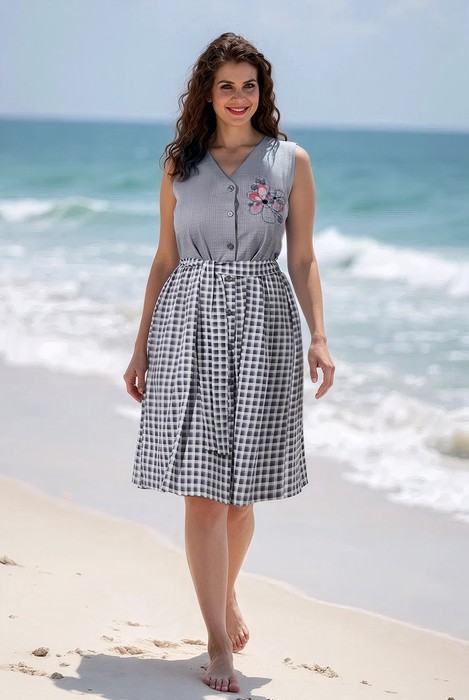 Сарафан из трикотажного полотна «кулирка» в сочетании двух видов в единой цветовой гамме: с мелкоузорчатым набивным рисунком, имитирующим ткацкое переплетение «рогожка» и с рисунком в мелкую клетку, отрезной по линии талии, с V-образной горловиной, центральной бортовой застежкой на обметанные петли и пуговицы и вышивкой на левой полочке лифа. Горловина спинки и проймы окантованы основным материалом. Юбка присборена по шву соединения с лифом. Съемный завязывающийся пояс фиксируется двумя шлевками из окантовки, вставленными в боковые швы на уровне талии.