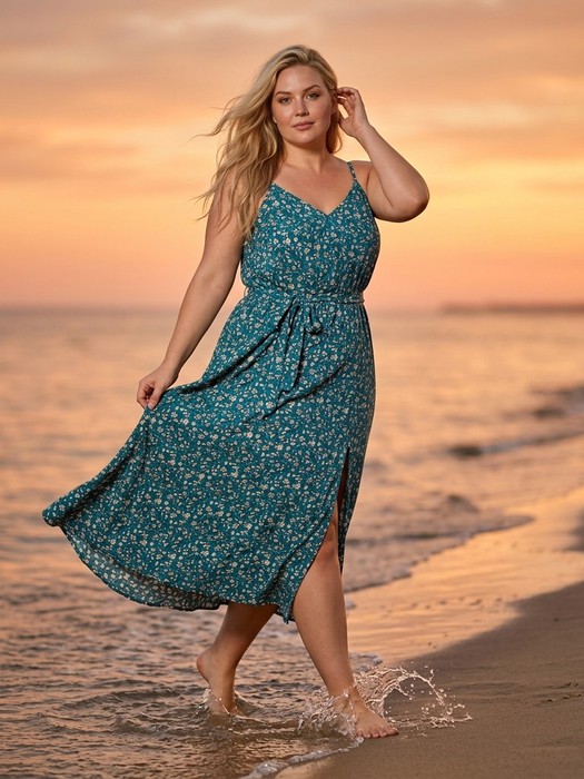 Сарафан молодежный из тканого полотна «штапель» с набивным рисунком, с углубленной V-образной горловиной, на узких бретелях, отрезное по линии талии, с расклешенной юбкой, собранной с помощью эластичной тесьмы. Горловина и проймы окантованы основным материалом. Переднее полотнище юбки из двух частей, в соединительном шве выполнен разрез. Изделие комплектуется съемным поясом, завязывающимся на талии.