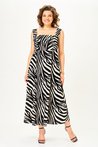 Сарафан "макси" без рукавов с застёжкой на запах на функциональные петли и пуговицы. Вырез декольте V-образный. По линии талии спинки эластичная вставлена эластичная резинка. При надобности, платье легко слегка расширить или заузить по талии, переставив пуговицы.