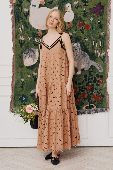 Платье-сарафан свободного кроя из хлопковой ткани ришелье. Хлопковая подкладка до нижнего подреза, по плечам бретели на завязку. По переду и спинке фигурный вырез горловины, обработанный кружевной тесьмой, которая плавно переходит в боковой шов. К лифу пришиты воланы на сборку. Между нижними воланами вшита кружевная тесьма.